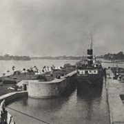 This photo looks at the locks from upstream, the direction from which we come as divers on our long approach drift (15-18 minutes). Note that, although the depth of any river increases as we move away from shore, the tops of the walls here are all at the same height, quite close to that of …