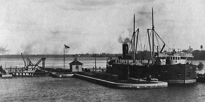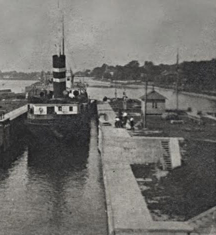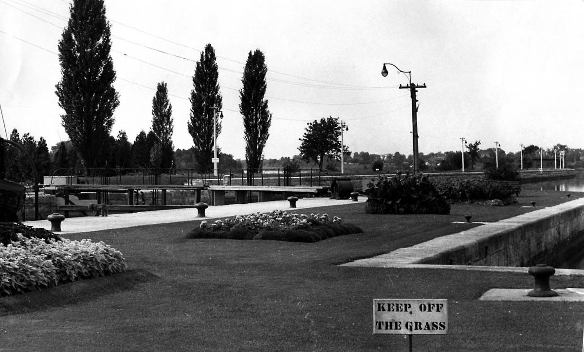 In this photo, courtesy of stlawrencepiks.com, you can see the grassy section between the two locks. Starting upstream, note its important features: the initial curved approach wall, the dark rectangular and circular flower beds, the lock house in the centre, the position of the downstream Lock 23 gate, and the drop in depth where the wall curves inward, showing the stairs leading to the lower level and the larger sideways stairs at the end of the grassy area. The second set of “stairs” was merely the staggered face of the sandstone blocks where they changed levels. Remember that the lock provided 12 feet of lift – the drop is simply the difference in water depth between the lower and upper gates. Moving out of the photo in the lower right corner is the long approach pier where ships waited for their turn to enter the locks.