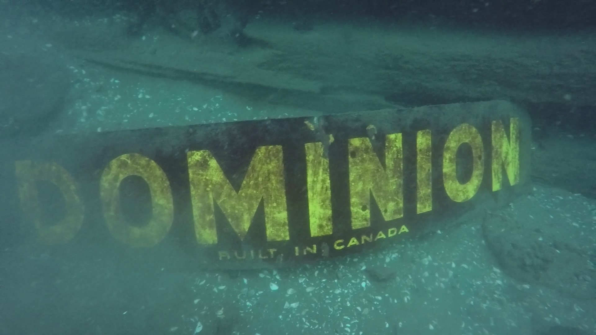 The third crib is in the best condition and it has the most obvious landmark on its north side – a brightly painted “DOMINION” sign. Divers like to look after this sign, dusting it off regularly so that it leaps out at you as the place you want to be! That’s because it’s from this crib that you proceed northeast to your next exit landmark. (Last year for the first time – ever – I looked at my compass while cruising along the north side of the cribs to note that they were already positioned on a northeast heading!)