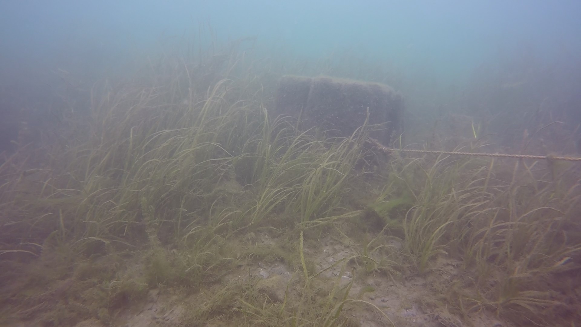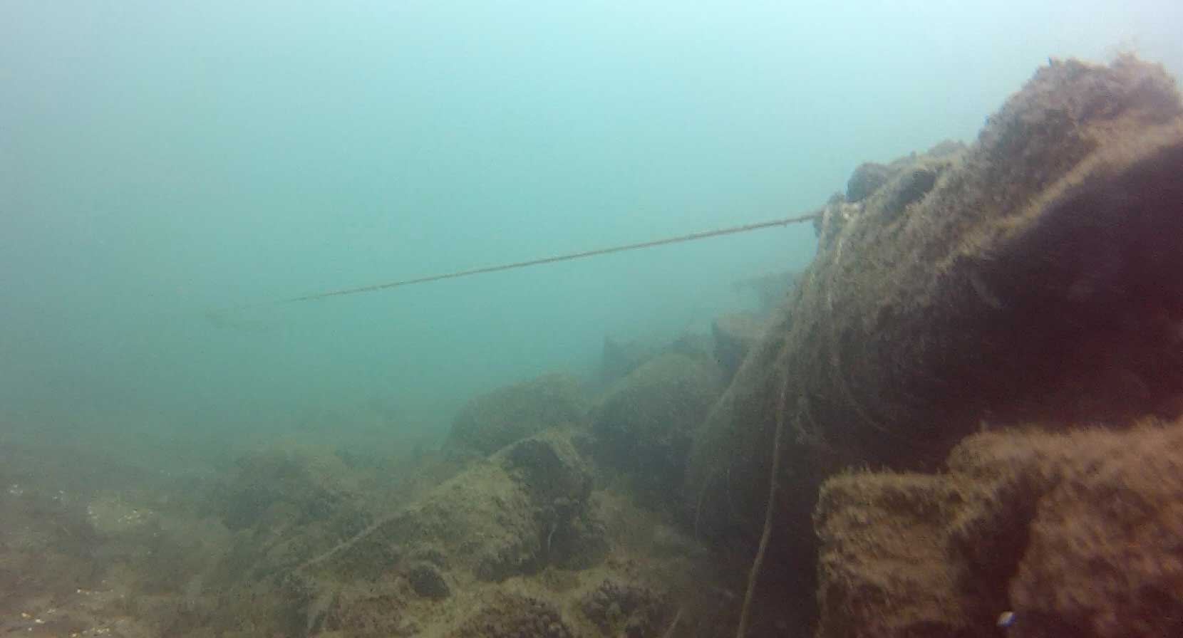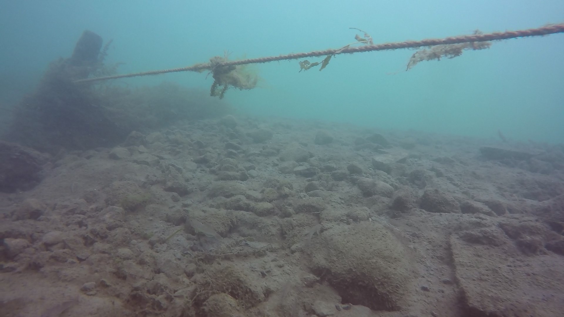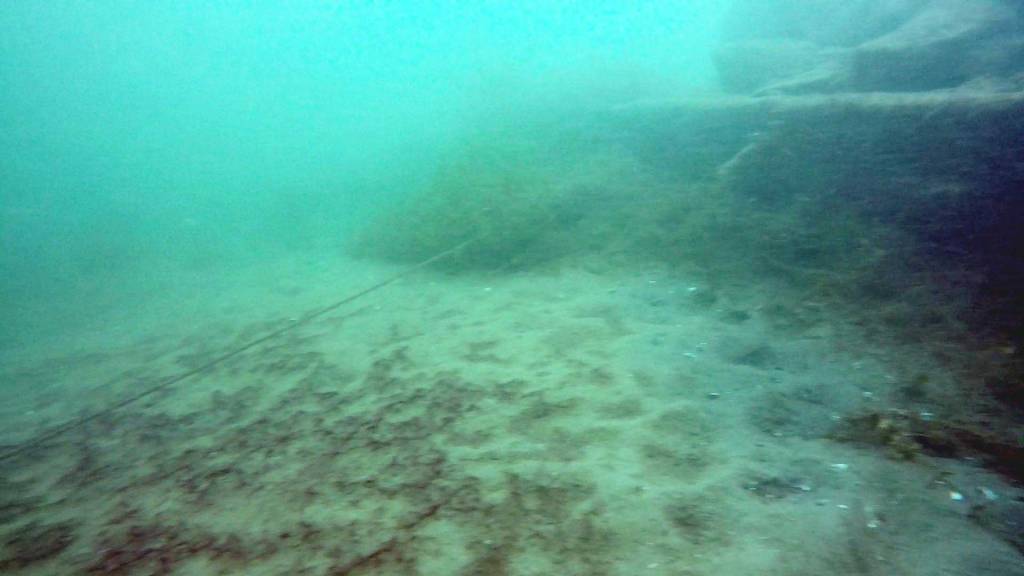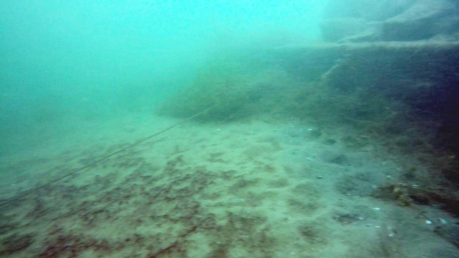 At the third crib (where you’re in about 32 feet of water), there is a taut line from long ago, before I started diving here, and still in excellent condition, running due north (note – 2022 – the line has shifted a bit with the recent high currents, and runs more NNE now) from the crib at its SE corner (you’ll likely be drifting along its north side – turn the corner and look for the rope close to the ground).