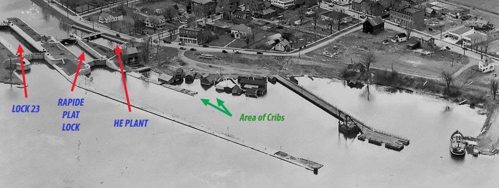 Most divers enjoy going up and over lock walls to explore more than one spot, ultimately ending up in the area beyond the HE Plant (its tailrace) where there are lots of posts, stumps, and general paraphernalia to investigate. There are 3 large cribs (each about 25 x 15 feet and separated by 20 feet) at the end of the tailrace which mark the start of our standard route to get back to the Morrisburg beach.