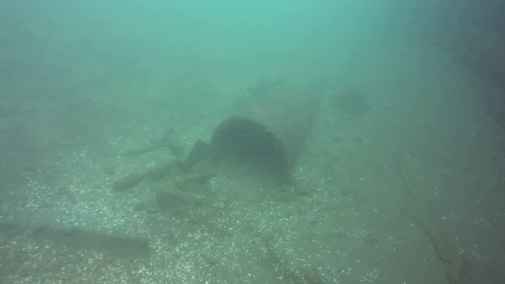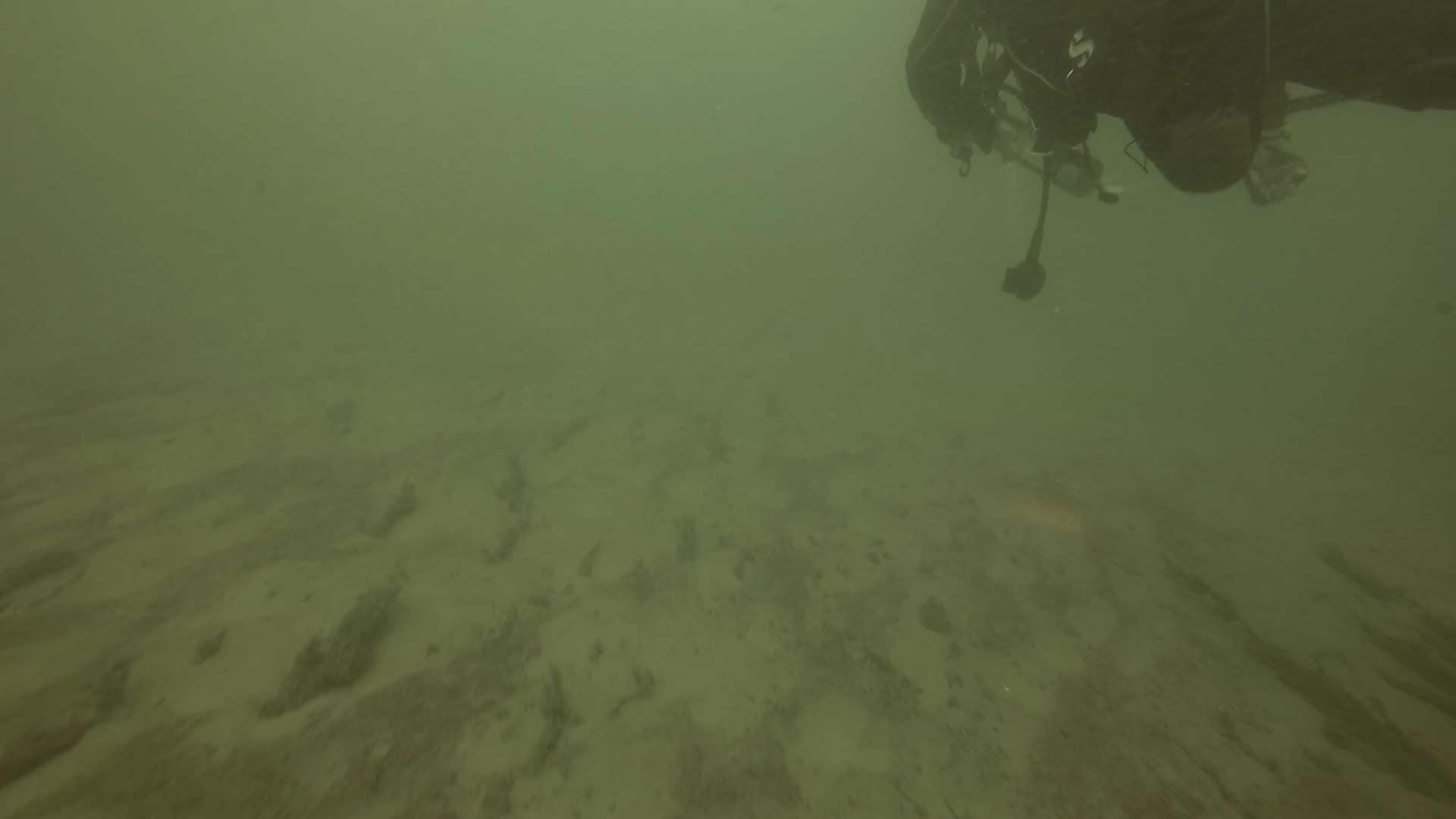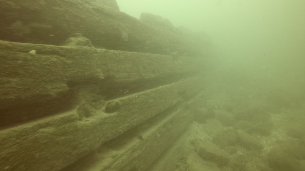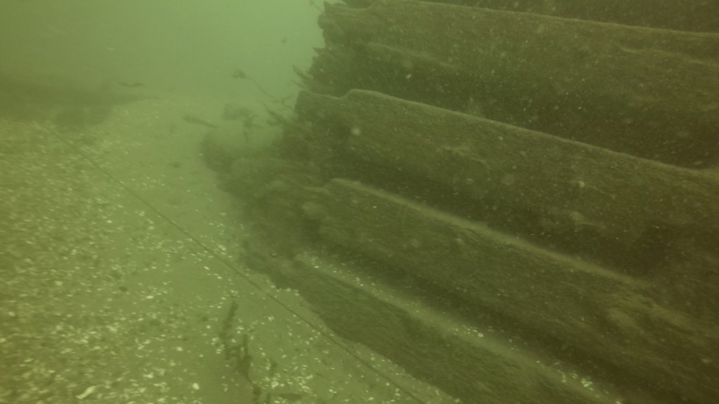 You’ll find yourself swimming over a reasonably boring river bottom when, at around 25 feet, you’ll notice “something” in the relative gloom ahead. It’s the crib of the municipal wharf, noteworthy in that its wooden sides are constructed of squared timber (like the 3 cribs you were just at) but it’s much larger, lower, and rectangular. Divers often talk about it sitting “in a hole” but what they’re experiencing is the gradual incline of the berm in front of it where, as in other parts of the lock, river flow has been impeded and silt dropped. You usually run into the wharf at its short side, like in this video. Larry’s silt cloud added a little more gloom haha.