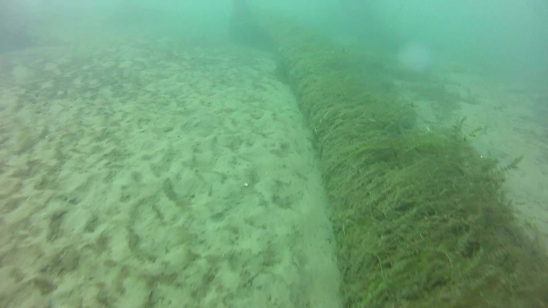 At the stump, it’s a matter of heading due north through almost no current (but a veritable forest of weeds) to the beach. The stump is pretty much even with the beach but still a fair distance (about 200 meters) out. Depending upon water levels, it sits at 13-15 feet.