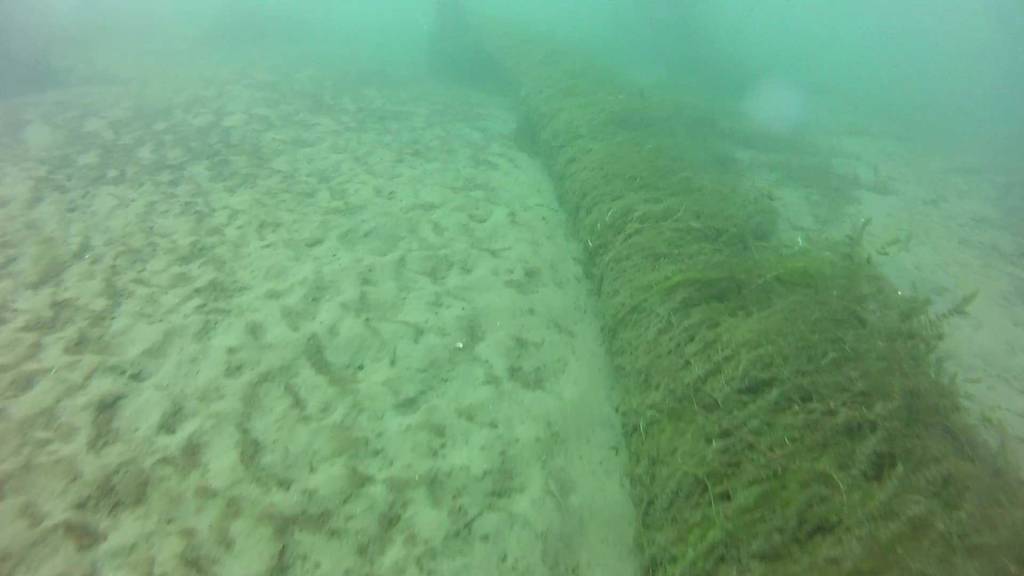 Head to the east end of this pad and, you guessed it, set your compass northeast again. You’ll see more of those ground-hugging weeds roughly pointing out your direction as you slowly swim for 3-4 minutes, passing over an assortment of man-made posts, planks, building debris, and miscellaneous boulders until another structure suddenly presents itself ahead. It’s the old ferry dock crib, at about 20-22 feet. The ferry travelled between Morrisburg and Waddington, NY in the early 1900s.