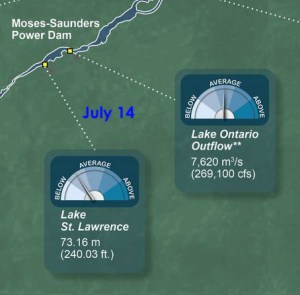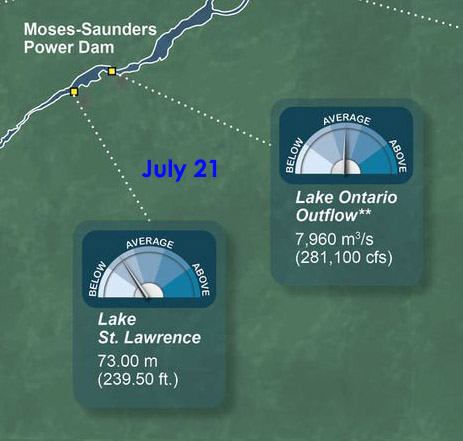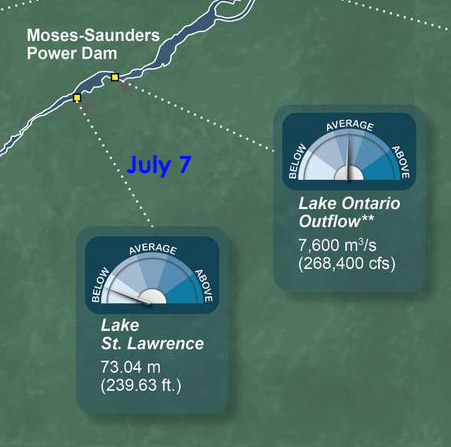 The heavy rainfall in the last couple of weeks raised Lake Ontario by nearly 3 inches although it still remains 9 inches below its mid-July average. The Board has therefore returned the area to normal flows as of July 17. For us this means the dams are open and we let Mother Nature control the flow. While current may be speedier, our water level may drop even more as flows through Cornwall increase, favouring higher levels at Montreal.