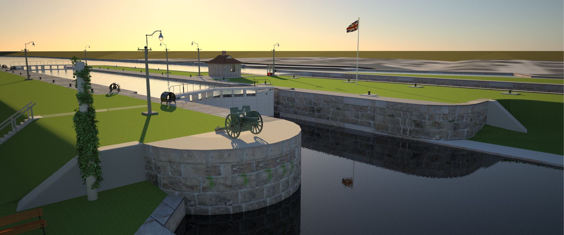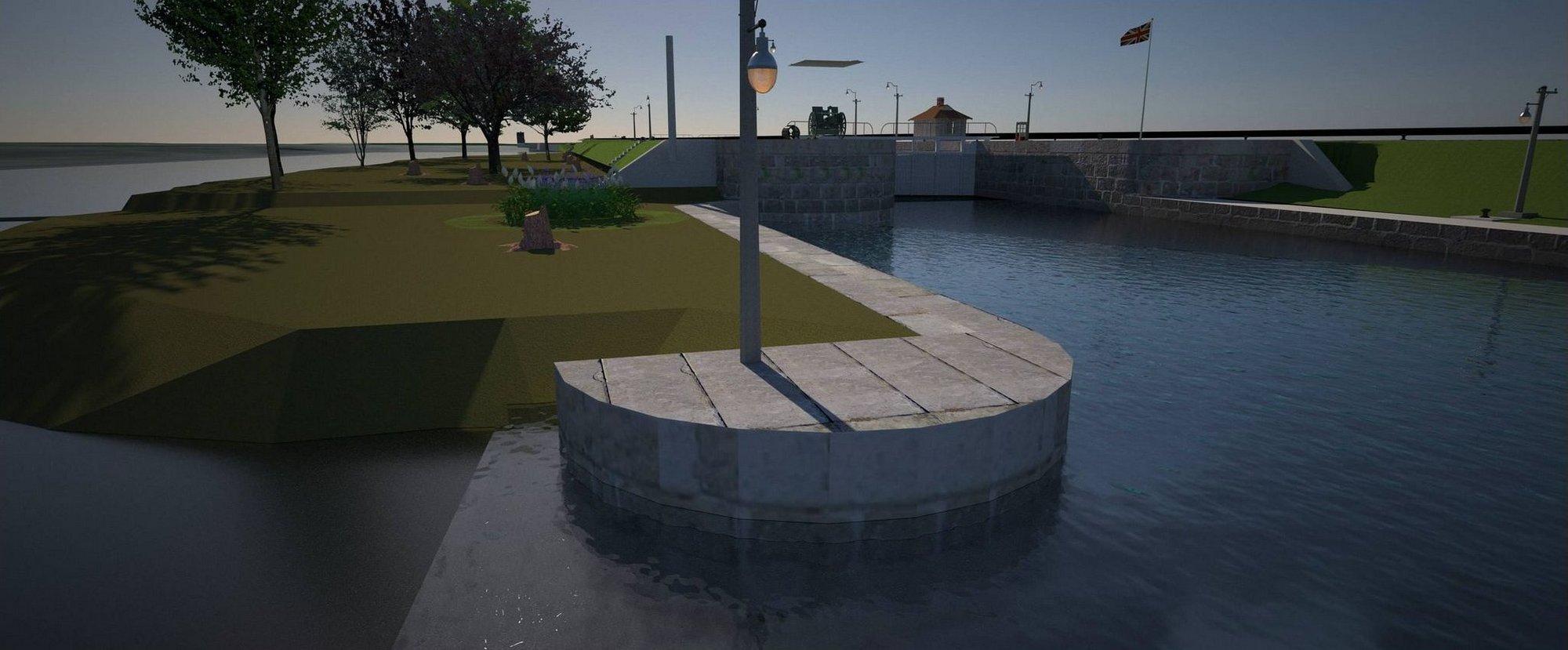 I’m going to pause for a moment to repost the St.Lawrence Piks photo from above, then add 2 photos of the beautiful computerized images fellow diver Christian Remillard has built of Lock 23. His first shows the curved end of the lock itself. All upstream and downstream entry points were always curved to minimize damage from ships accidentally running into them. The second is the curved wall set at a lower depth which is the concrete end of the parkland that runs alongside the lock.