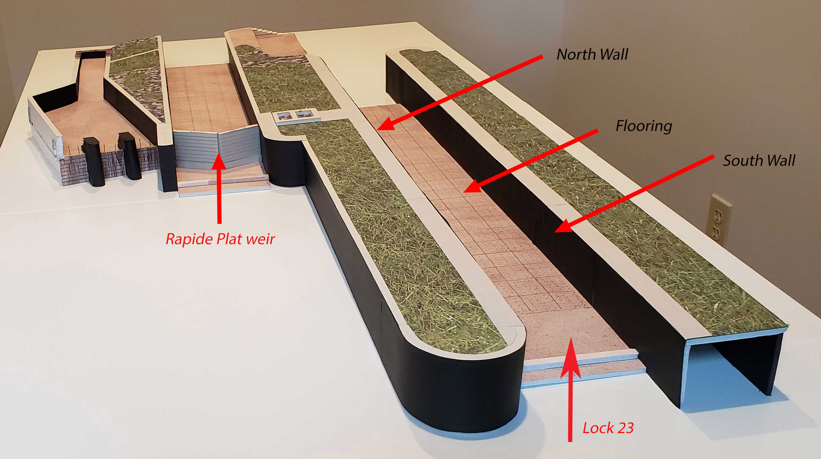 Its downstream end lies just beyond the weir of the older Rapide Plat Lock. This is important to remember because… should you reach the end of its flooring and choose to leave by climbing the north wall, you’ll cross the grassy area between the two, then descend and find yourself in the upstream area of the Rapide Plat Lock.