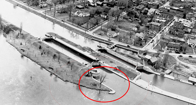 Lock 23 is the newest and largest structure of the entire site, constructed in 1905. Its enormous south wall extends upstream well beyond the end of the lock for almost a kilometre.