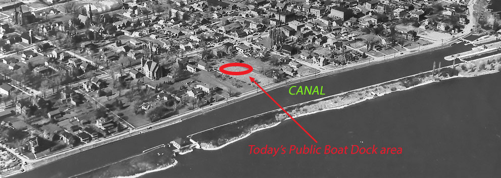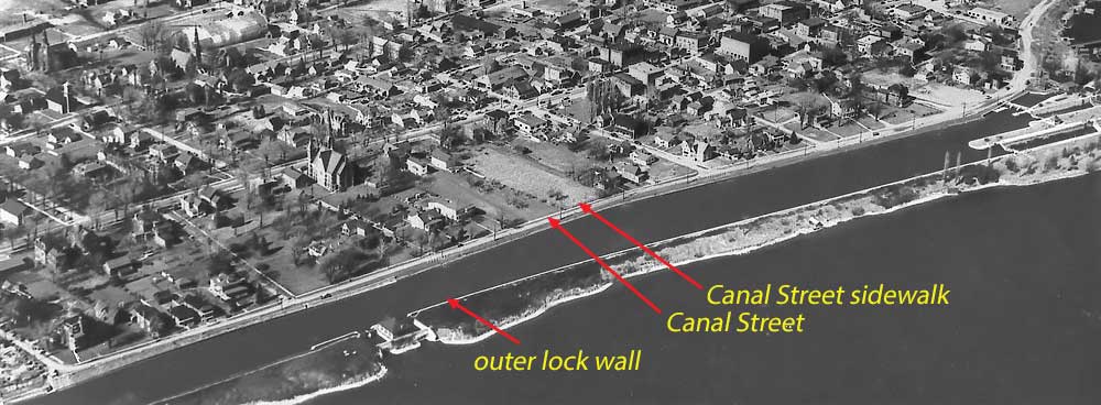 Take a moment to examine this old overhead photo. You can see the man-made canal constructed alongside the St. Lawrence River. You can see the outer wall of the lock running upstream. You can also see Canal Street (strange name, eh?) along with its sidewalk beside the canal.