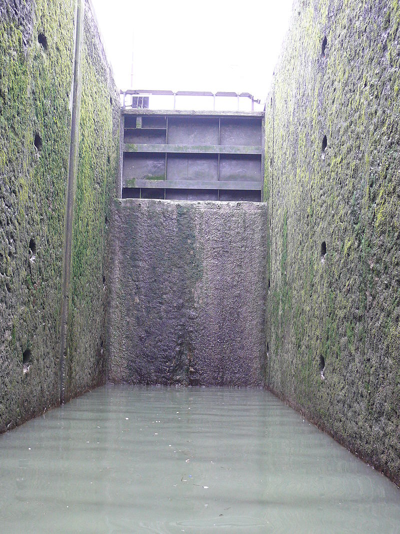 The Lock 23 upstream walls were 14 feet high to accommodate the greater draught (the minimum amount of water for a boat to float without touching the bottom in either the locks or canal). When diving, as you drift through the locks, you drop the 12 feet of river depth and notice that the walls at the lower end are considerably higher.
