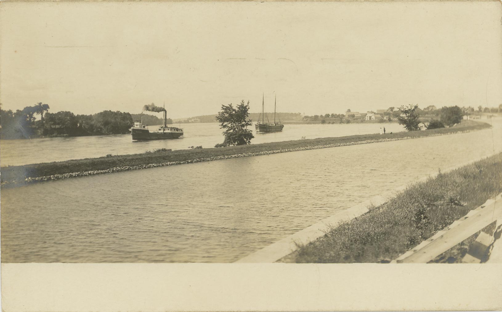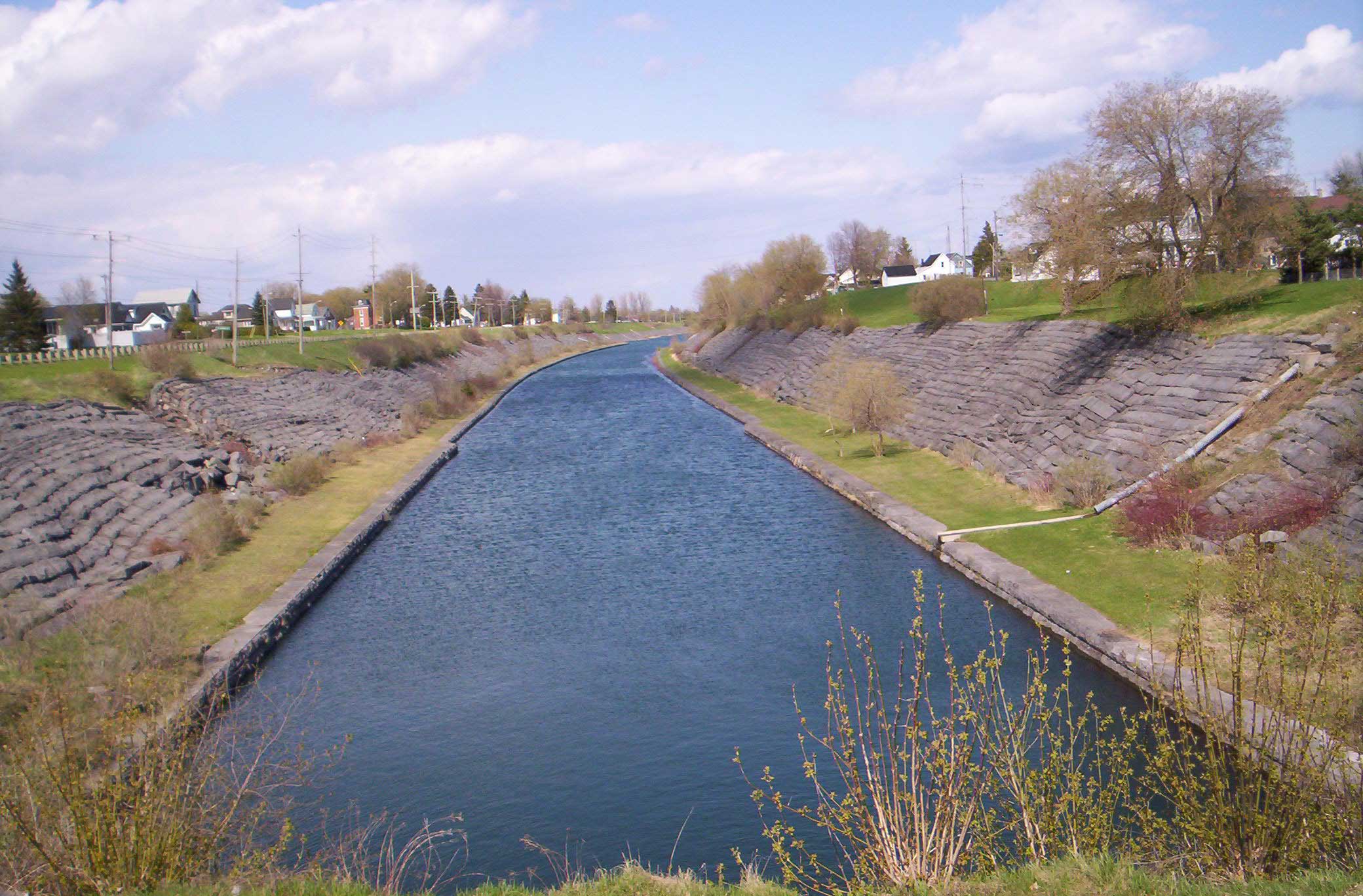 The Rapide Plat Canal, which fed the Rapide Plat Lock and later Lock 23, was an example of a “navigation” canal. It was built parallel to the river to create a reservoir to fill the locks and a channel for the boats to then travel upriver as they went past the Rapide Plat (“Flat Rapid”) – a table-like set of swift rapids that stretched over 4 miles (6.4km) and a 12-foot (4m) rise in the river.