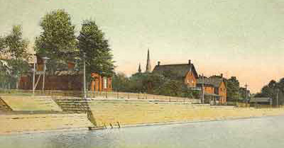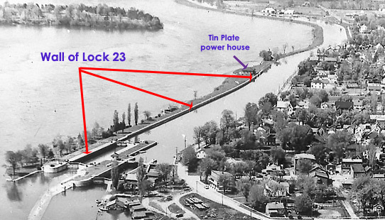 When the larger Lock 23 was constructed in 1905, its enormous south wall was extended far upstream to just beyond where you see the Tin Plate Factory Power House on the berm in this photo. The berm remains behind the wall, expanded and developed as a Park in the area of the lock itself. From the Tin Plate upstream, it continues in its original form.