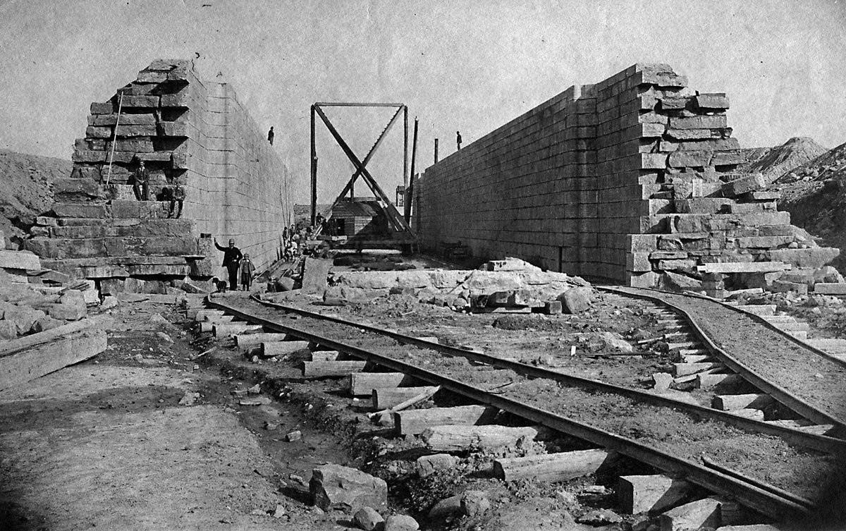 Canals built in the 1850s, including the Rapide Plat, would all have had berms as their south walls, consisting of the debris and earth removed when excavating the canal. Protection from erosion and damage was increased by the addition of stone laid on top of the earth. This was known as a “rip rap” wall.