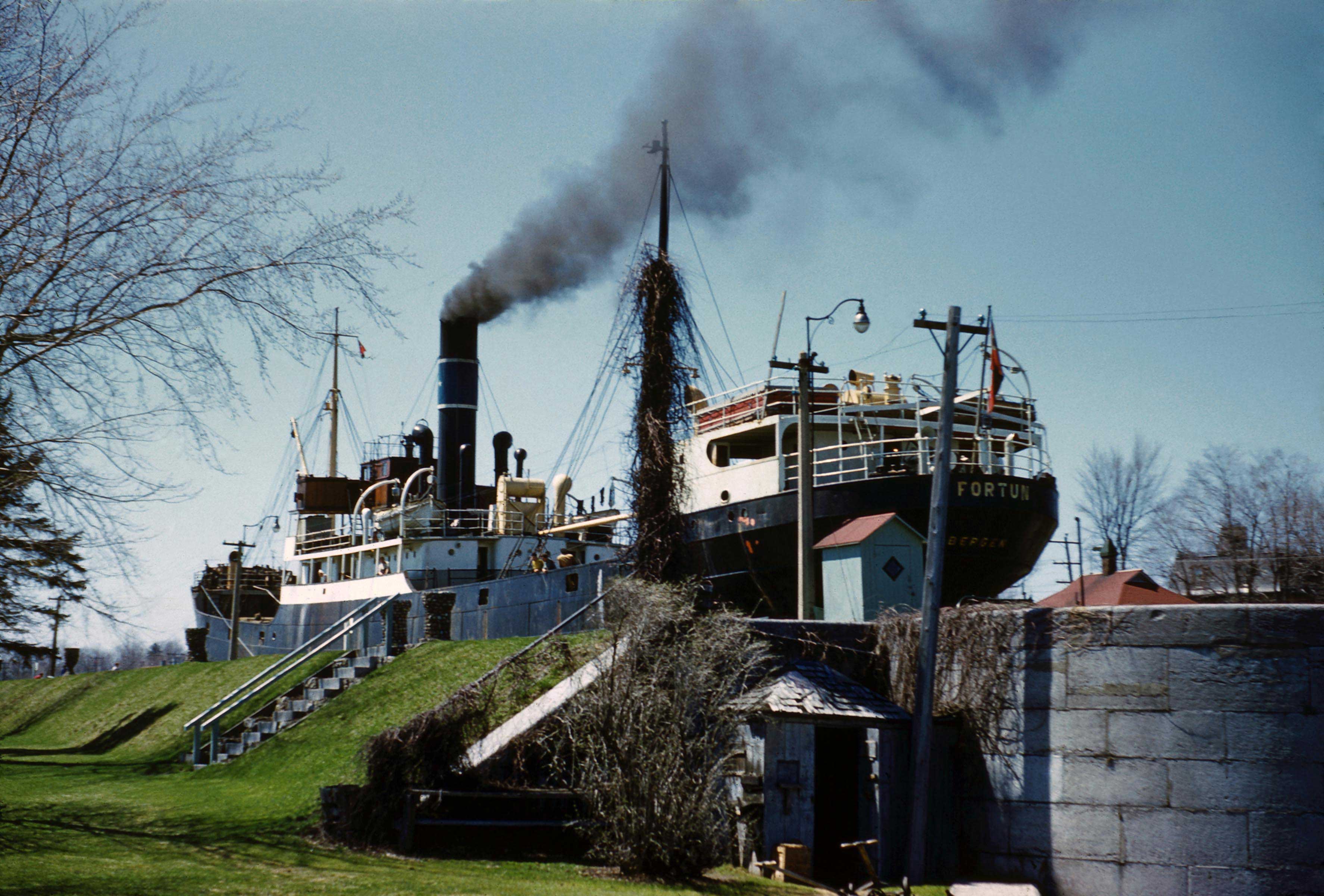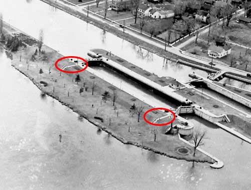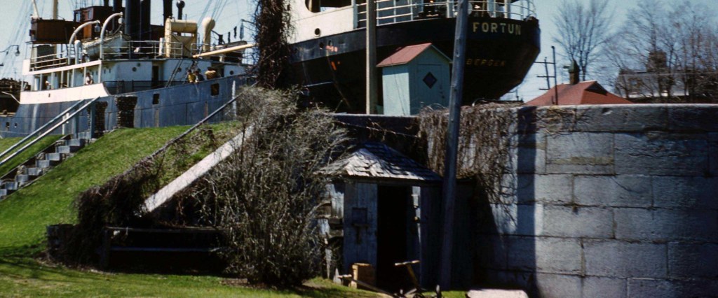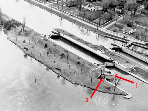 Once you’re past the second set of stairs, you’re nearing the end of the upper park and will quickly come to the curved wall that marks the end of the lock where the water level is now that of the downstream river (1). Note the angled end of the lock wall (2). Nestled into the corner was once a small shed which appears to have housed tools for park maintenance. The high position of the freighter demonstrates the lock level raised and the ship ready to exit.